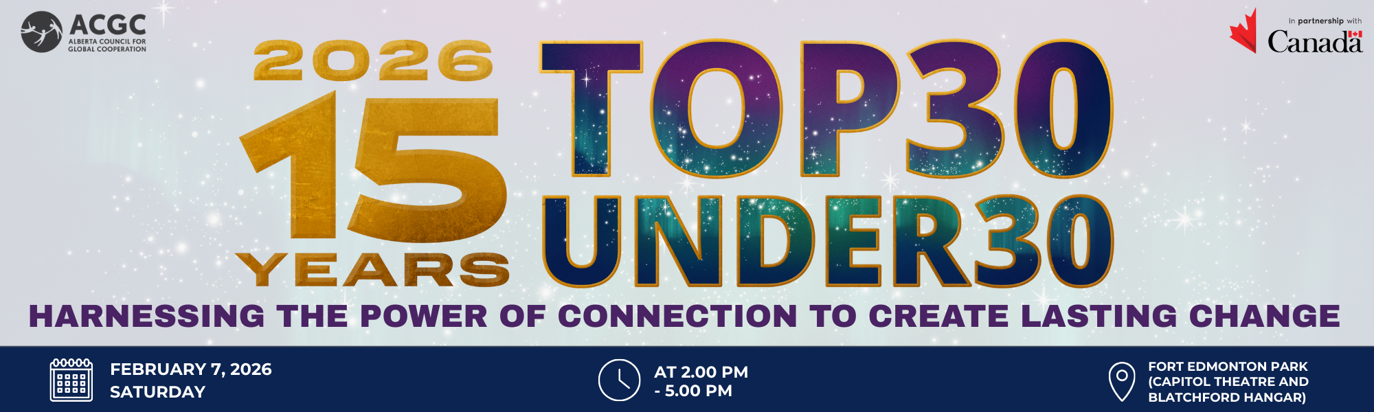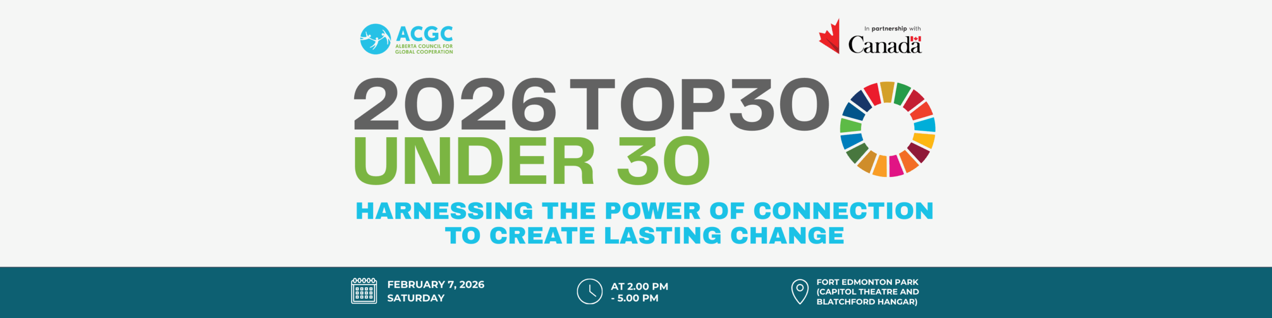 The Top 30 Under 30 award is presented annually by the Alberta Council for Global Cooperation (ACGC) to recognize and amplify the work done by young people who help achieve the 17 Sustainable Development Goals (SDGs). Every year, our selection committee chooses 30 outstanding individuals from a collection of nominations across Alberta and the world. These few are selected for their contributions to our global community, their compassion for those beyond figurative and literal borders, and their connection to Alberta. Among many other benefits, selected youth will be featured in the annual Top 30 Under 30 campaign and recognized at a public Top 30 Celebration event during International Development Week. ACGC continues to provide the opportunities for these young people to develop themselves as leaders in Alberta, Canada, and the world.
