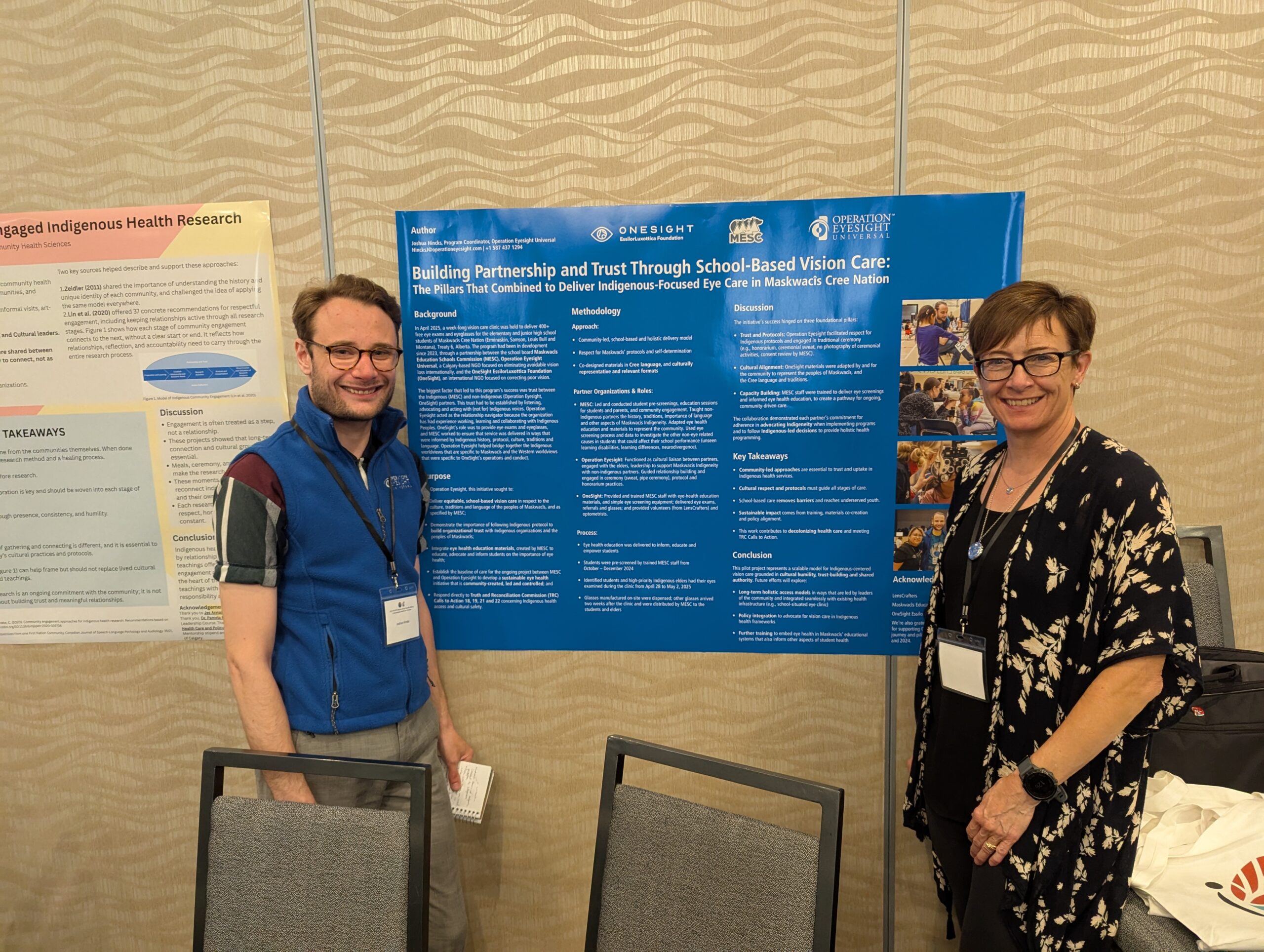 My work primarily focuses on SDG 3 (Good Health and Well-being); SDG 5 (Gender Equality); SDG 10 (Reduced Inequalities); SDG 11 (Sustainable Cities and Communities); and SDG 17 (Partnerships for the Goals). The project I’m most proud of had been in development for two years and culminated in an event that took place between April 28 and May 2, 2025, which is best read about here. I, alongside my colleagues at Operation Eyesight, worked to manage the relationships between Operation Eyesight, Maskwacis Education Schools Commission (MESC), and the OneSight EssilorLuxottica Foundation (OneSight) throughout those two years of development.