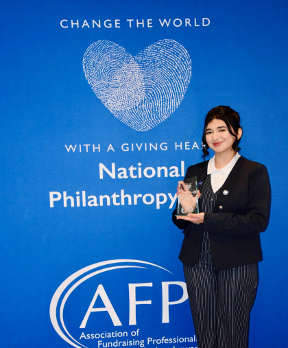 Shiza Hirani is awarded the 2025 Outstanding Youth Philanthropist Award by the Association of Fundraising Professionals (AFP) on National Philanthropy Day.