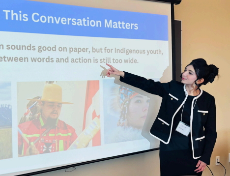 Shiza Hirani presents on Indigenous resurgence and youth leadership as the youngest workshop facilitator at the First Nations University of Canada’s “Igniting the Conversation” conference.