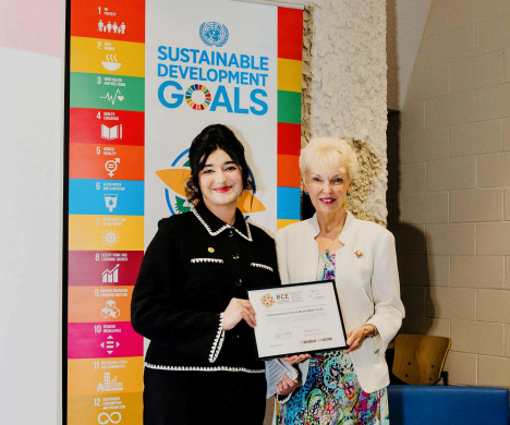 Shiza Hirani receives the Regional Centre of Expertise (RCE) Education for Sustainable Development Recognition Award from Her Honour the Honourable Bernadette McIntyre, Lieutenant Governor of Saskatchewan, in recognition of Youth MentorNet Café’s impact on quality education.
