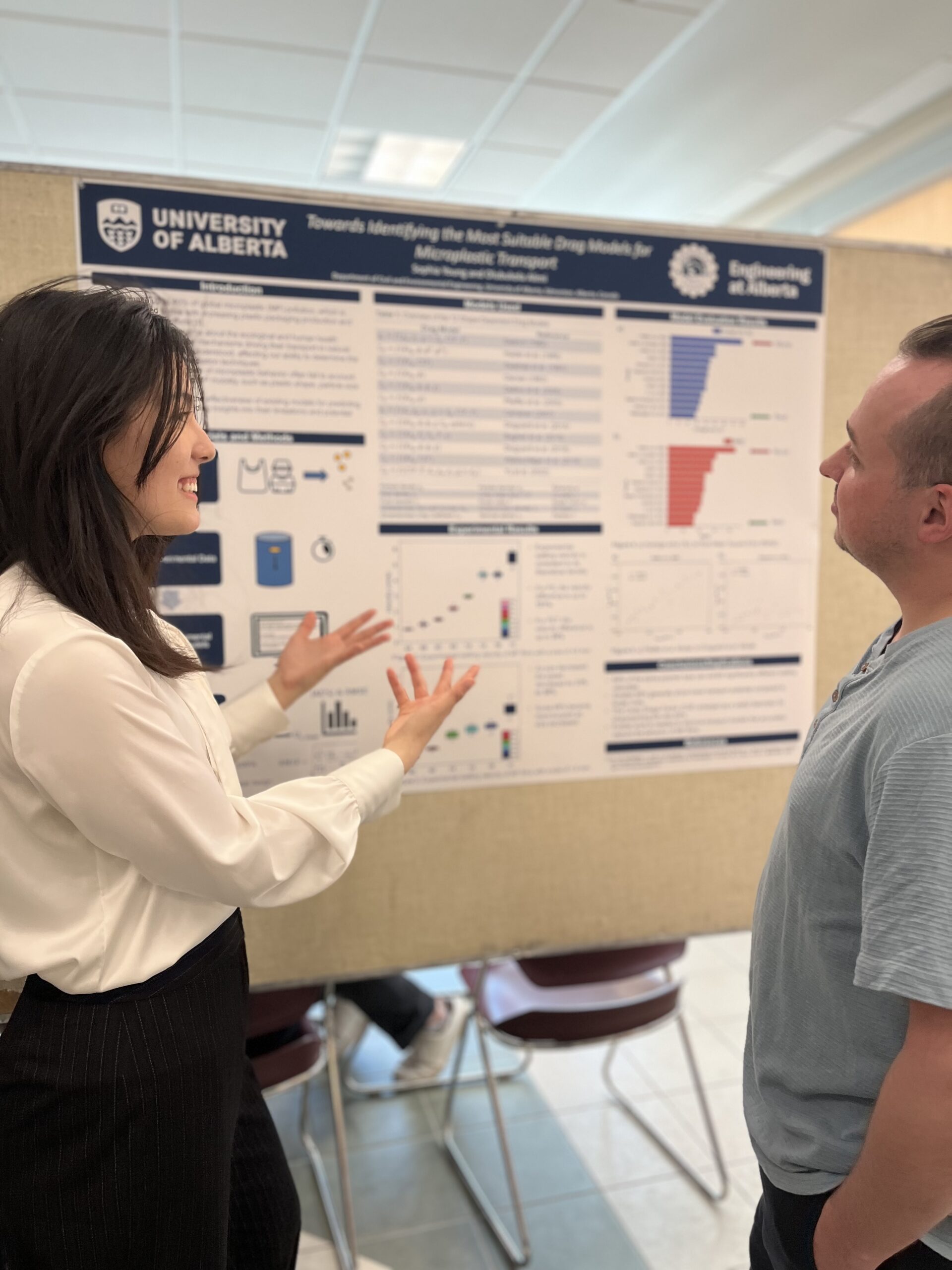 At the University of Alberta, I research the transport and fate of microplastics in aquatic systems, supported by an NSERC Undergraduate Research Award and two Dean’s Research Awards. My work contributes to manuscripts in progress and national conference presentations.
